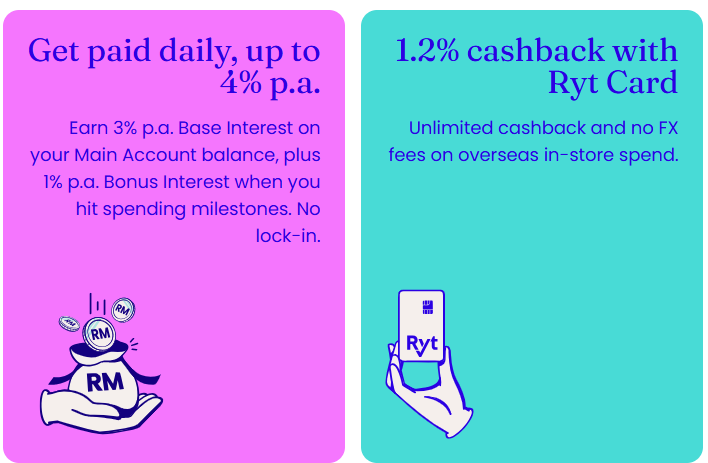 Ryt Bank itself provides around 3% p.a. as base interest on main account balance, plus additional 1% p.a. = bonus interest. While the amount may not be huge, it is still higher compared to many traditional savings accounts offered by conventional banks. Moreover, they do not have any lock-in period will ensure your fund to be highly liquid.
