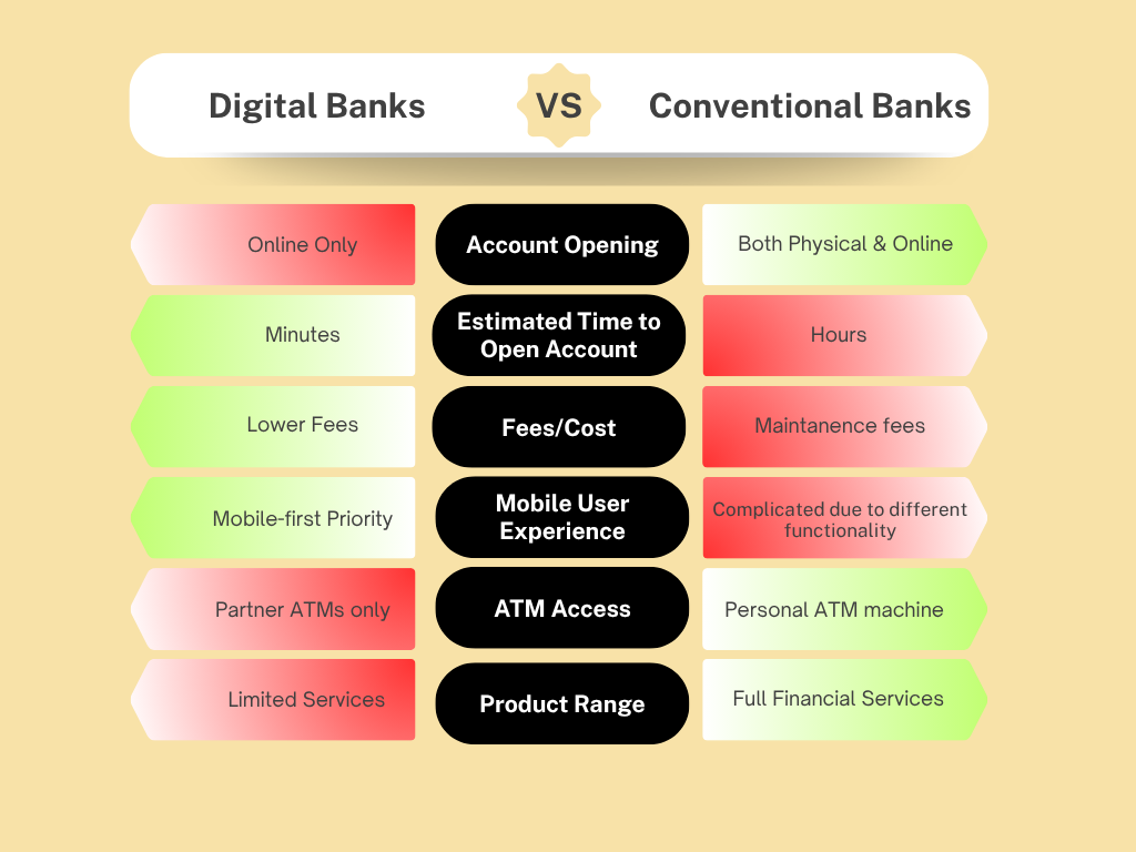 Here are a brief comparision between Digital Banks and Convetional Banks.