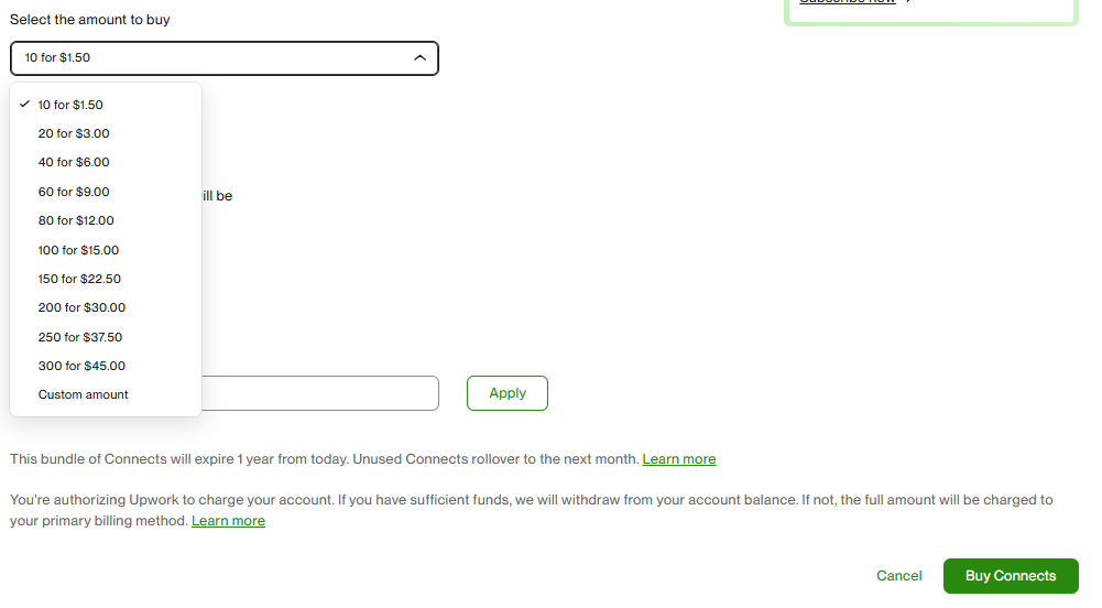 First of all, Connects are credits inside Upwork , you can use it to apply for jobs , boost your profile and bid for projects.Therefore , as of today 10 connects cost around 1.5 USD. On an average , usually a job costs you around 12-24 Connects to apply.